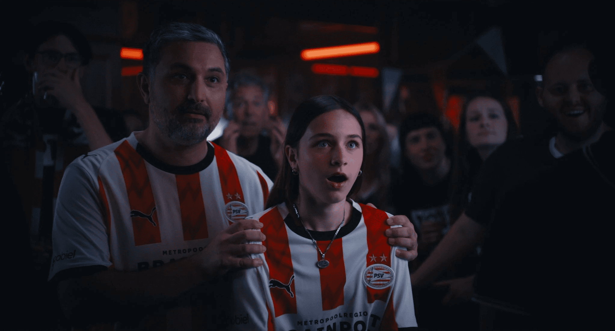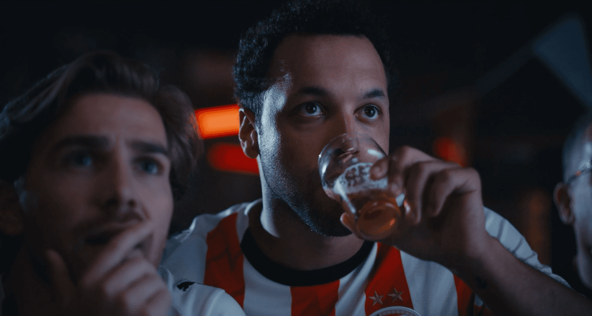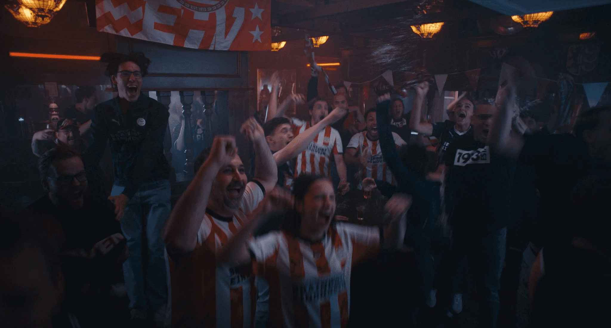A cinematic bar setting with controlled lighting and stylized tension. Grainy backlight visuals evolve into explosive color and motion. Slow motion, dolly zooms, and bold action explosion shots translate suspense into image. The new PSV home kit stands at the center of every frame, carried by real human stories.