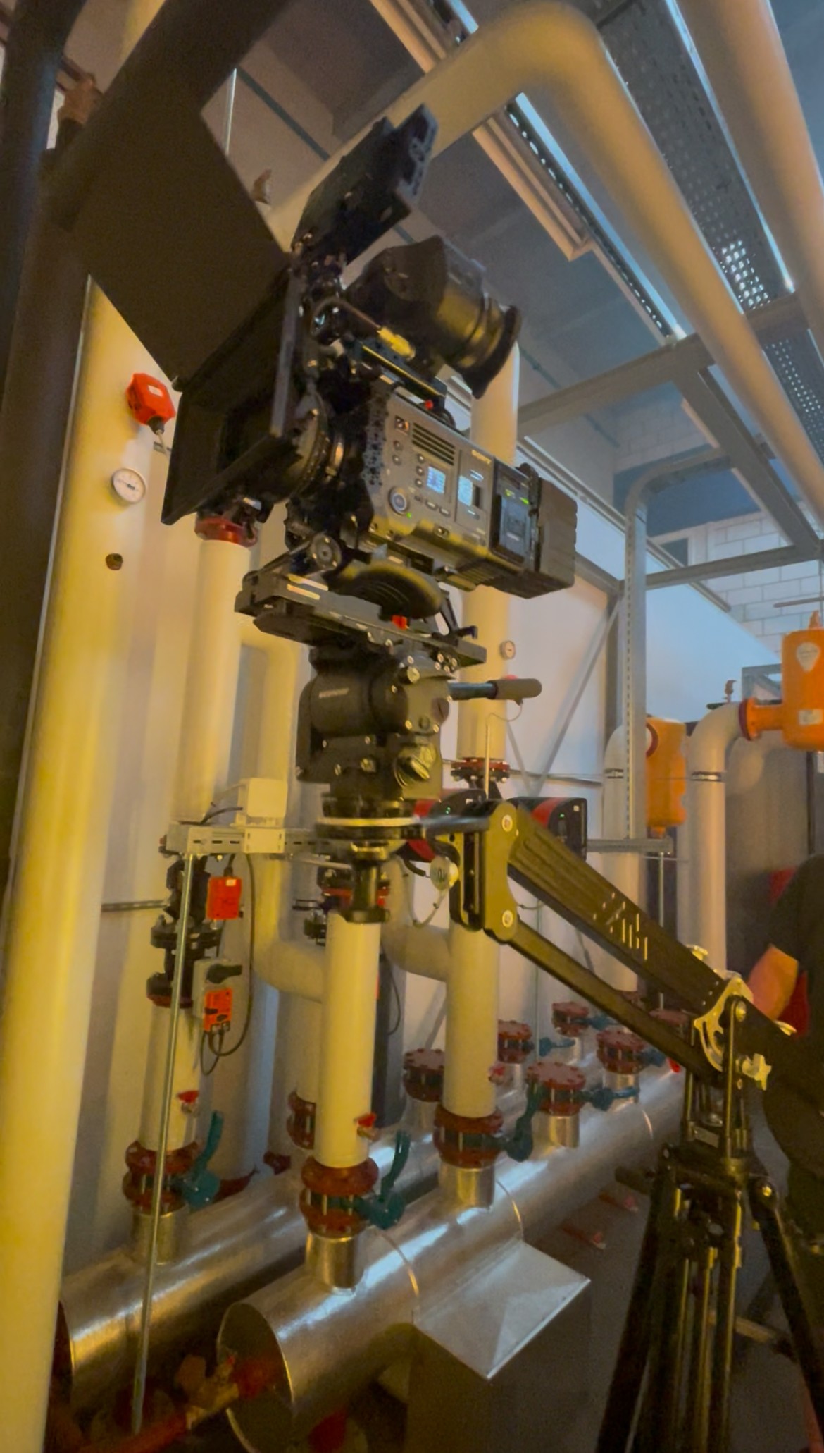 We shot with Carl Zeiss Jena lenses to combine extreme sharpness with a slightly stylised texture, making the heroes and the Spirotech machines pop against the surreal, saturated LED lighting. A six-person crew operated dolly, jib and lighting in perfect sync to create the long stabilised movements and shifting perspectives.